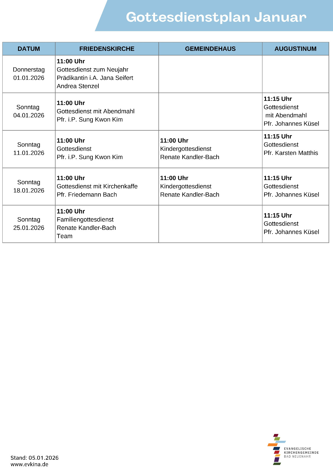 Nach der Flutkatastrophe im Juli 2021 ist die Martin-Luther-Kirche in Bad Neuenahr leider nicht mehr nutzbar. Unsere Hauptgottesdienste finden derzeit in der Friedenskirche in Ahrweiler statt. Gelegentlich finden auch Gottesdienste im Gemeindehaus statt.