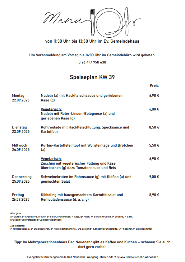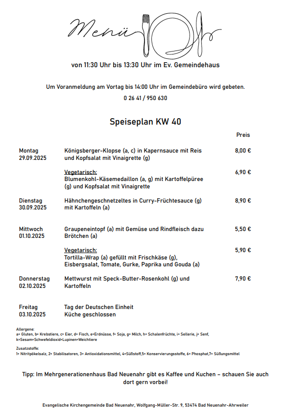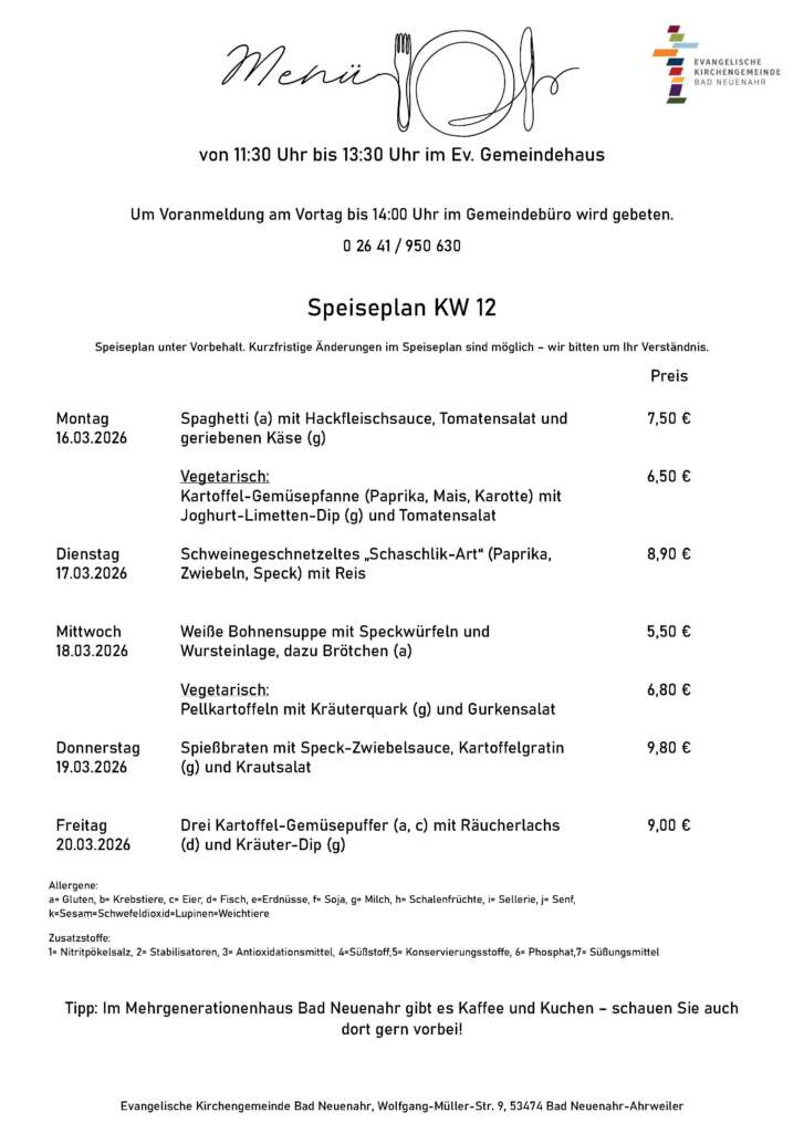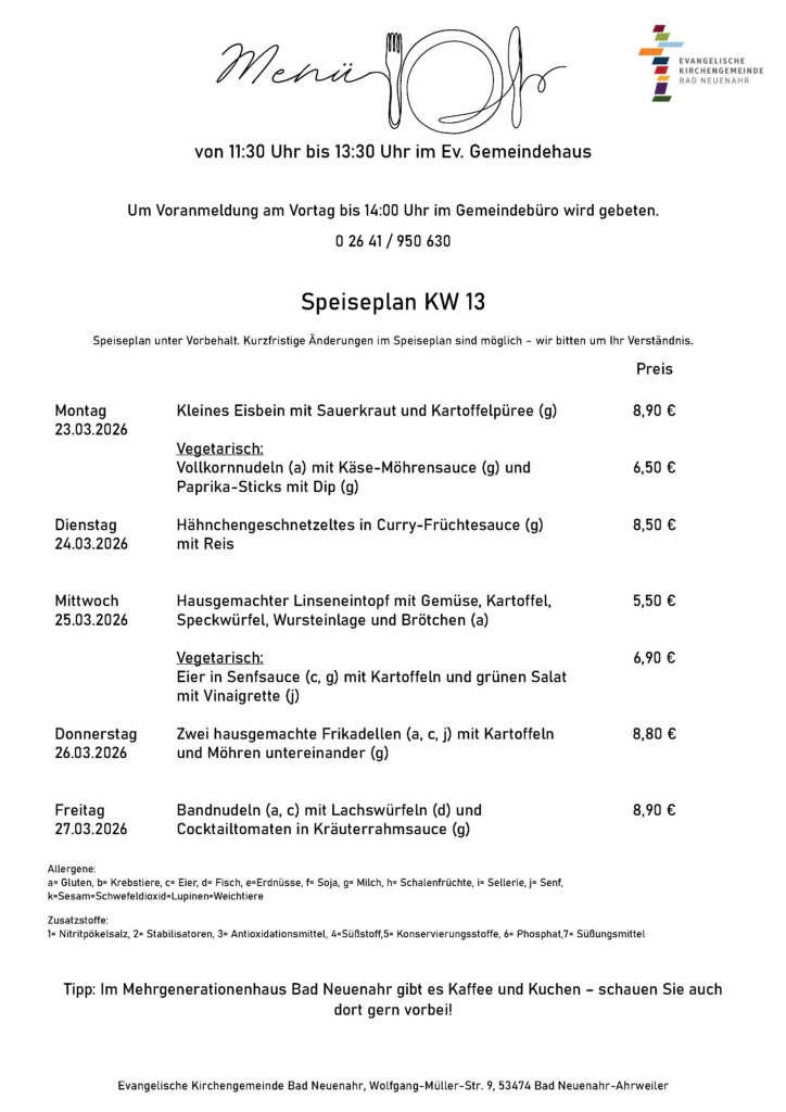 Wir bieten täglich frisch zubereitete, abwechslungsreiche Gerichte zu fairen Preisen. Der aktuelle Speiseplan ist im Gemeindehaus, im „Kerit“ (Second-Hand-Laden und Café), im Gemeindebüro und auf unserer Homepage einsehbar.
