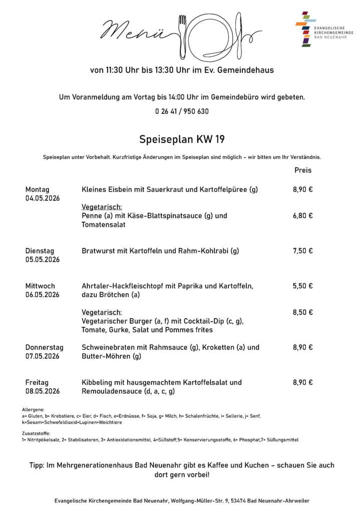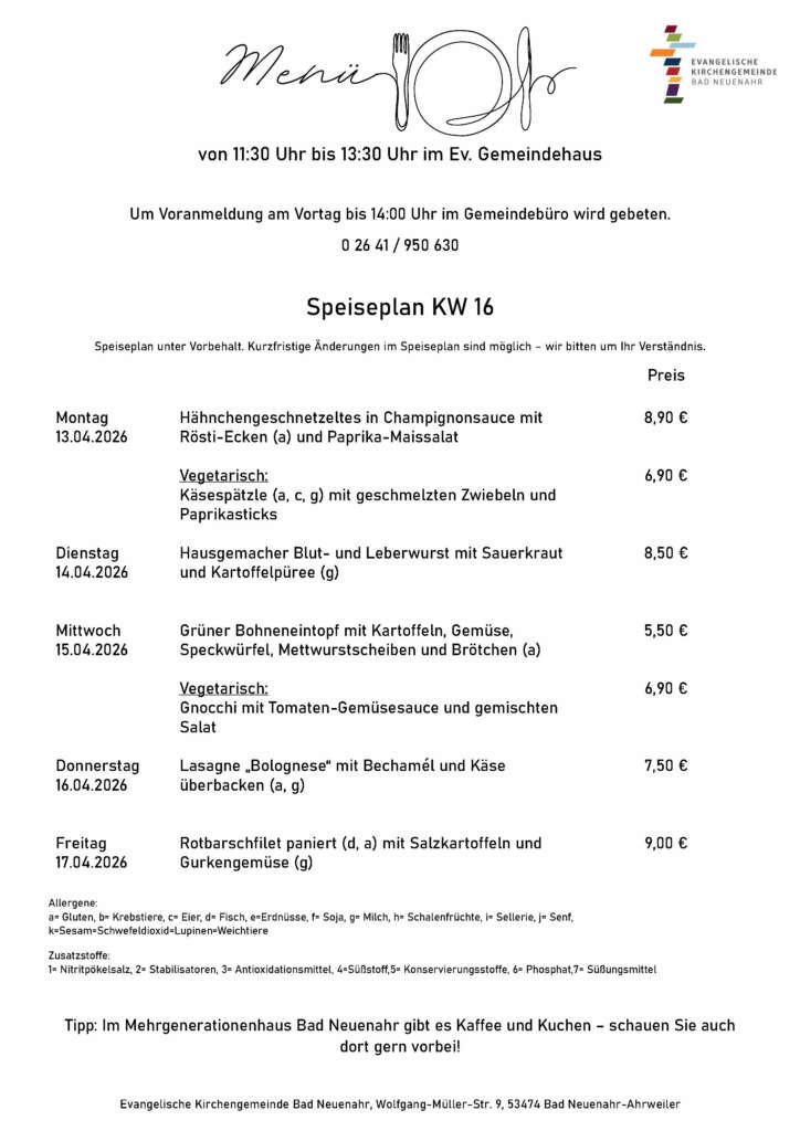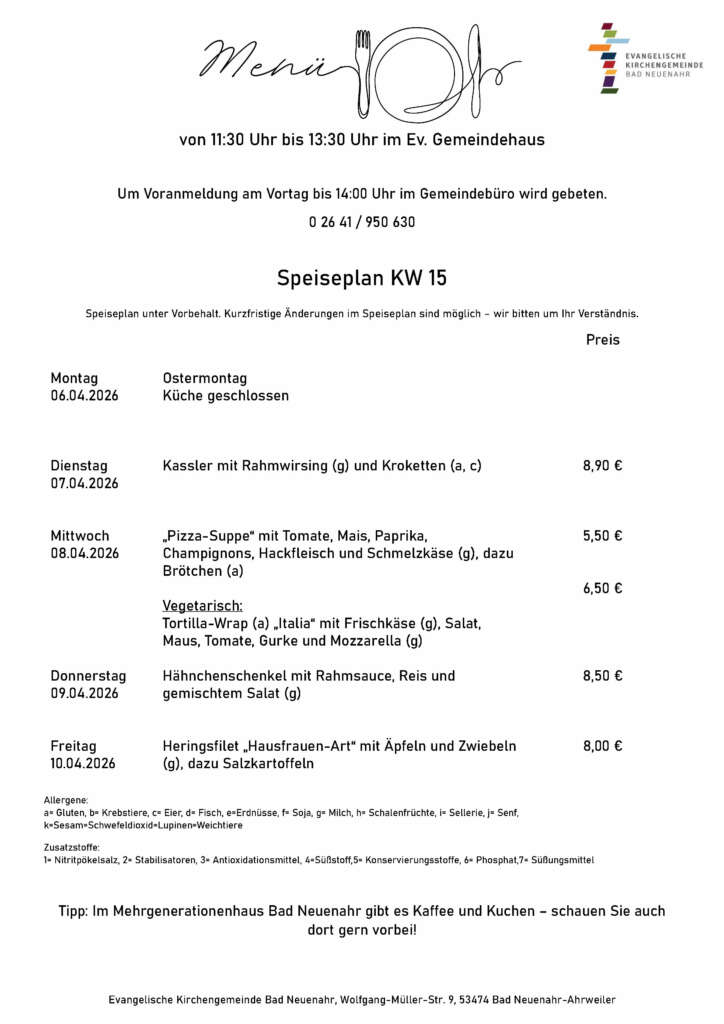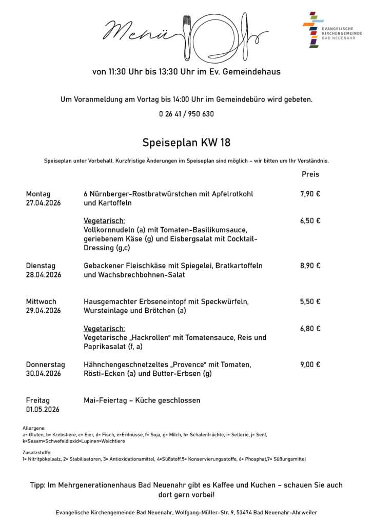 Wir bieten täglich frisch zubereitete, abwechslungsreiche Gerichte zu fairen Preisen. Der aktuelle Speiseplan ist im Gemeindehaus, im „Kerit“ (Second-Hand-Laden und Café), im Gemeindebüro und auf unserer Homepage einsehbar.