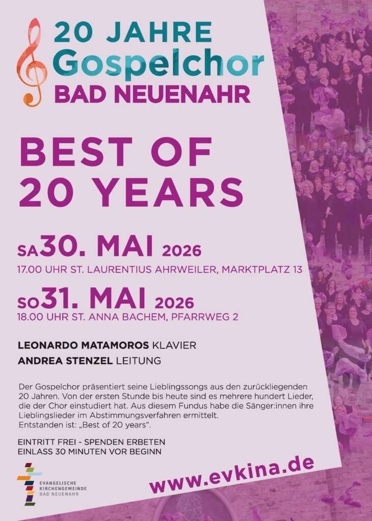 Der Gospelchor Bad Neuenahr präsentiert seine Lieblingssongs aus den zurückliegenden 20 Jahren. Von der ersten Stunde bis heute sind es mehrere hundert Lieder, die der Chor einstudiert hat. Aus diesem Fundus haben die Sänger:Innen ihre Lieblingslieder im Abstimmungsverfahren ermittelt. Entstanden ist daraus: »Best of 20 years«. Wie immer, ist das Publikum aktiv ins Konzertgeschehen einbezogen.
